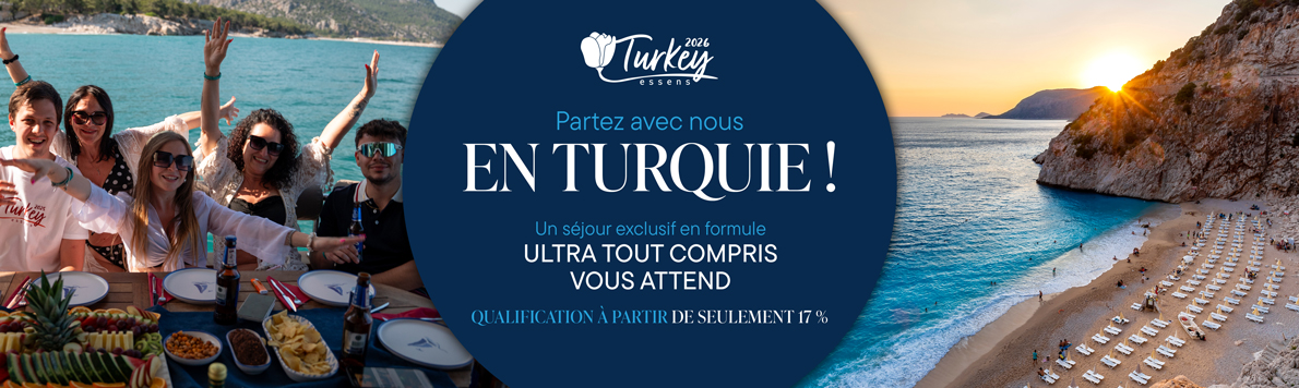 Si vous avez au moins deux membres dans votre ligne directe qui se qualifient pour ESSENS Turquie 2026 et participent au voyage, vous bénéficierez également d’un séjour exclusif en Turquie !