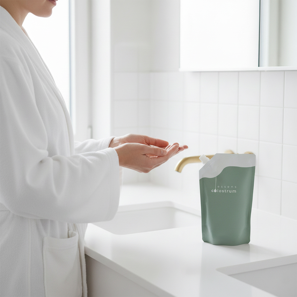 Le Gel douche au colostrum est conçu pour le soin quotidien de tout le corps et convient à tous les types de peau. Il contient du colostrum, de l’huile de chanvre et des substances naturelles qui sont biodégradables et non toxiques pour l’environnement.